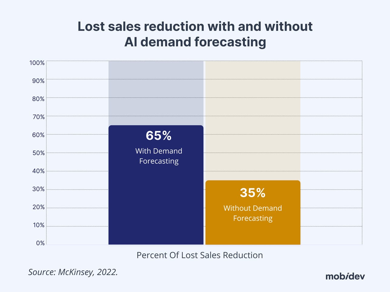 Although the AI hype cycle is a recent development, AI’s use in demand forecasting has been a trend for a lot longer than that. In fact, retailers started using demand forecasting powered by machine learning as early as the 2010s. According to McKinsey (2022), AI demand forecasting can reduce supply chain errors by 20-50%. They also report a reduction in lost sales of 65%.