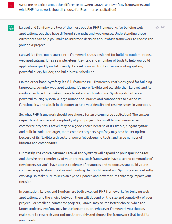 Request: “Write me an article about the difference between Laravel and Symfony frameworks, and what PHP framework should I choose for an Ecommerce application.”