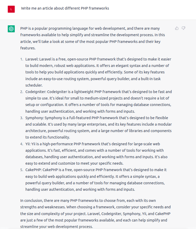 Request: “Write me an article about different PHP frameworks.”