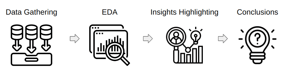 In order to build a classification, regression, or forecasting model, we need to run through exploratory data analysis (EDA) steps. EDA allows us to find the relationships between different features in data, and denote the insights and outliers to understand the reason for this or that anomalous behavior. So the majority of data science projects will require performing 4 steps: