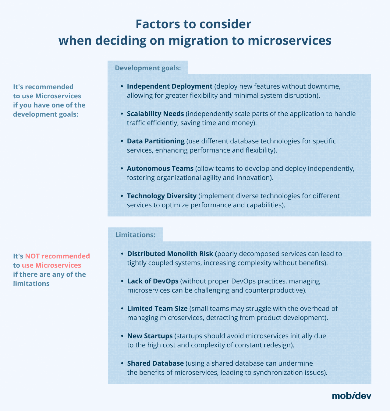 In the table below, I have gathered the most common cases when migrating to microservices could be the right decision and when this approach is not the best architecture solution.