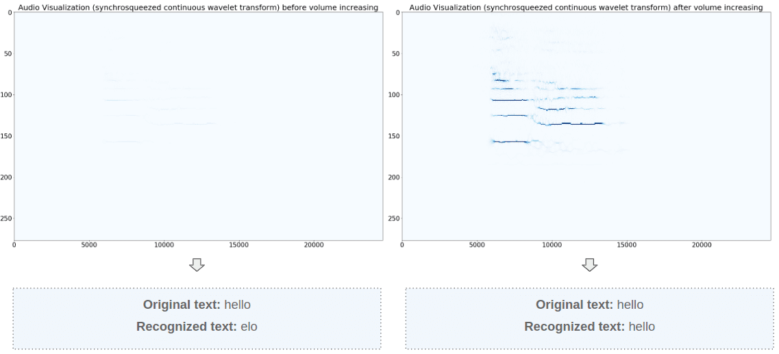 Here you can see an example of voice recognition without volume normalization, and also with it. In the first case, the model struggled to recognize a simple word, but after volume was restored, the results improved.