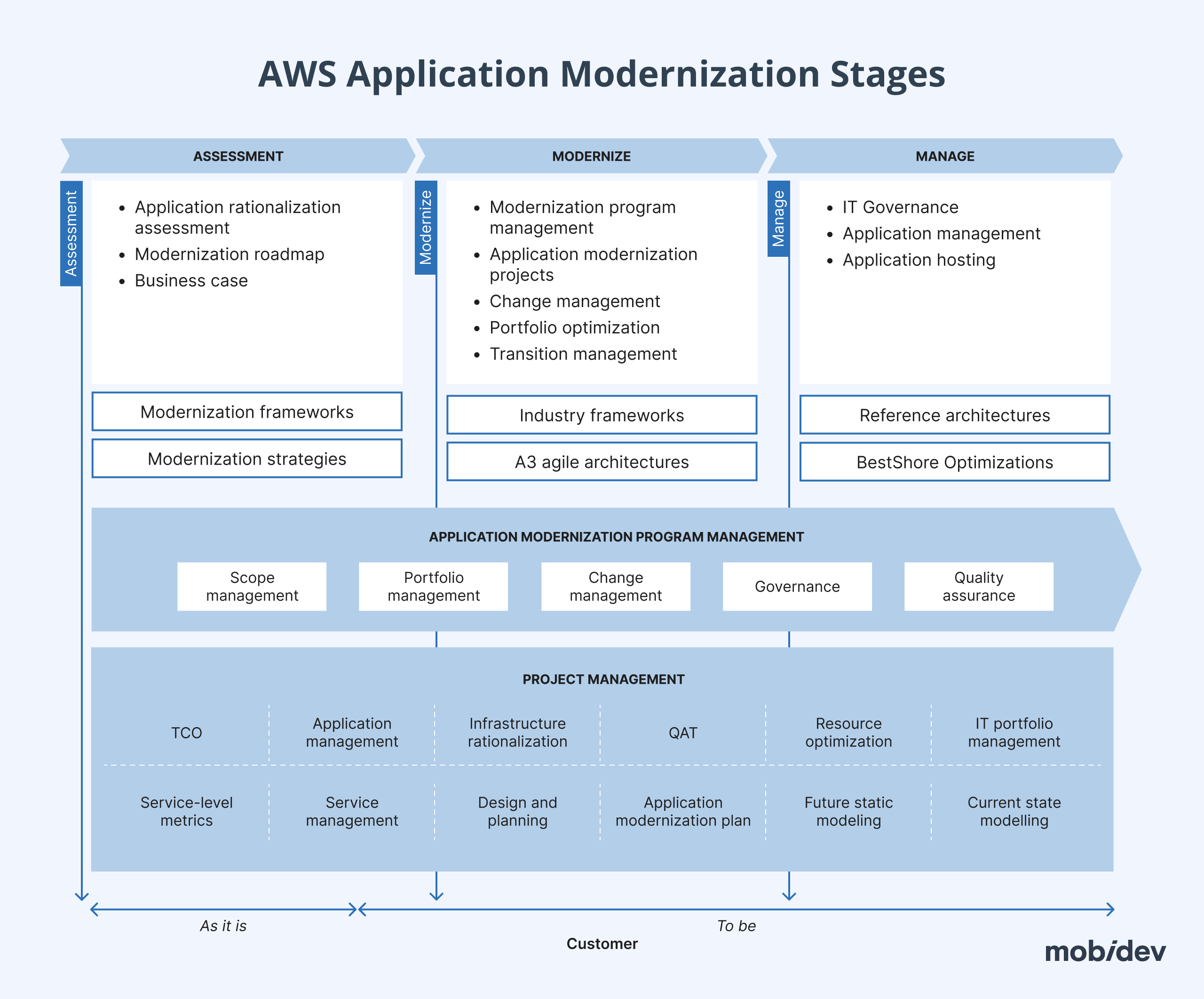 The main parts of the AWS modernization strategy include: assessing, modernizing, and managing stages. Let’s take a more detailed look at them.