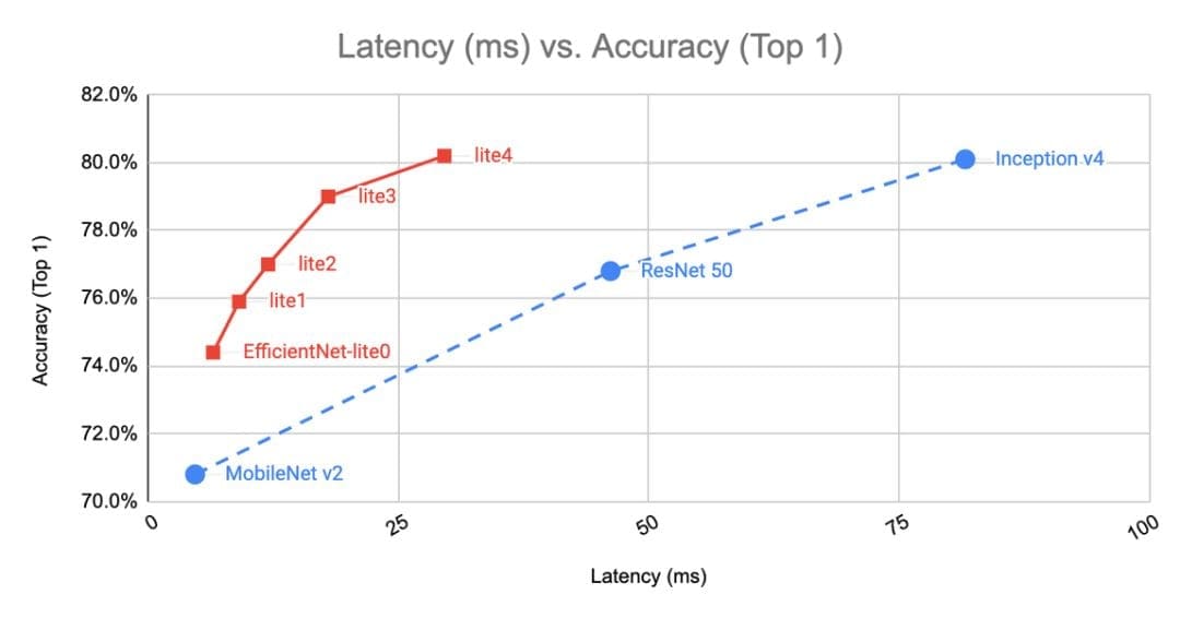 You can use a pre-trained model as a starting point for custom training. For example, apply the pre-trained EfficientNet model. Below, you can see its comparison with other options.