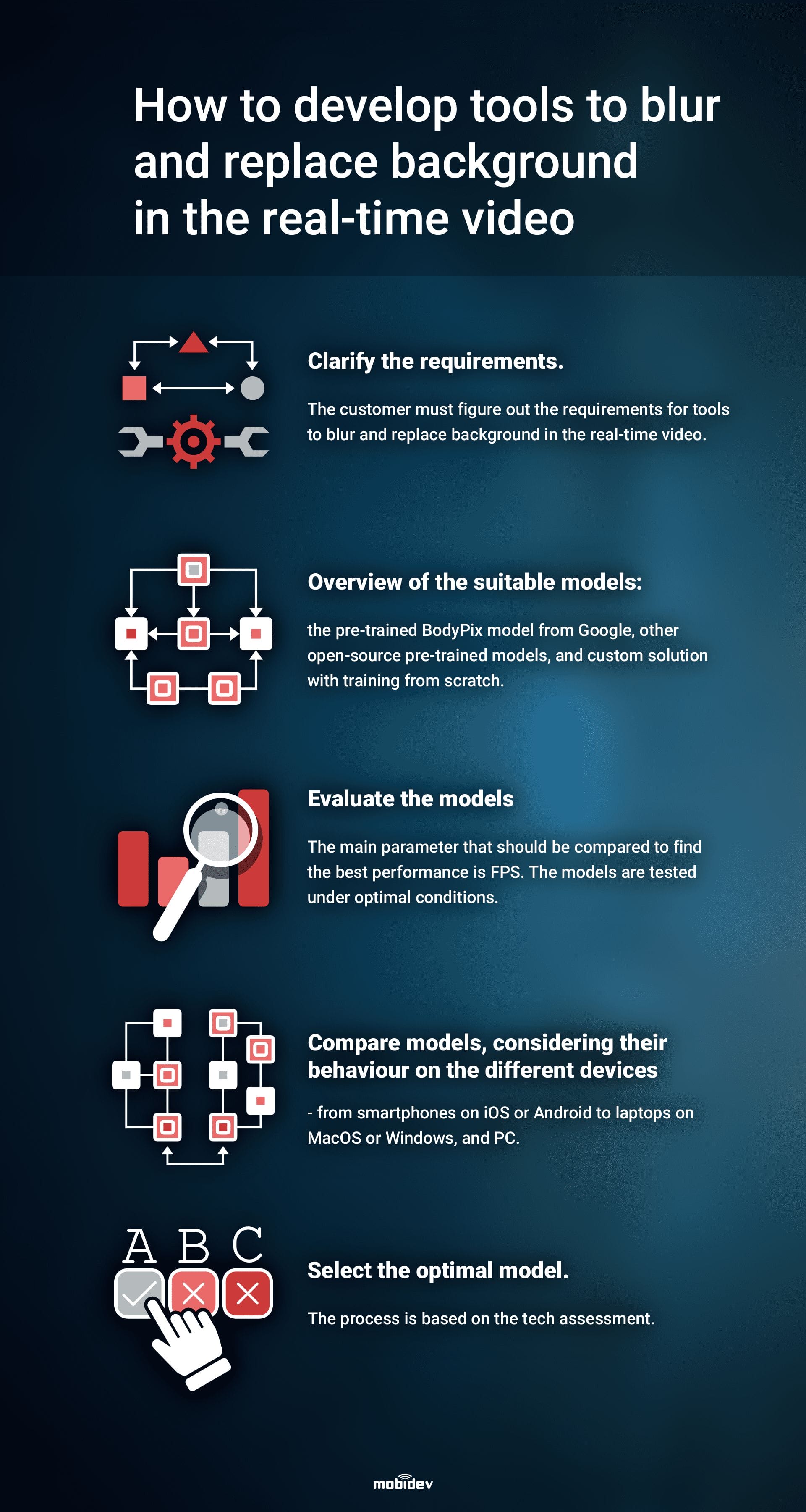 According to research, developing a real-time person segmentation model from scratch isn’t the best option. It is useful only if we need to prepare the model adapted to a particular scenario, for example, detecting a headset. Anyway, all the peculiarities of the technology choice you can see below.