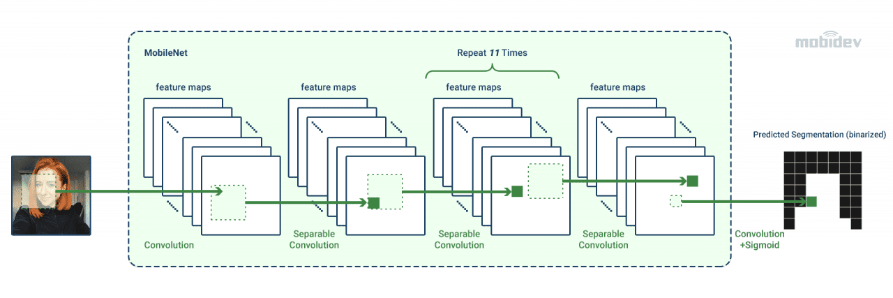 The ML model for segmentation must be lightweight, especially for running in the browser. The lightweight backbone allows reduced energy consumption and accelerated inference. The number of steps of frame processing depends on the input resolution. Therefore, we should down-size the image before integration in the model.