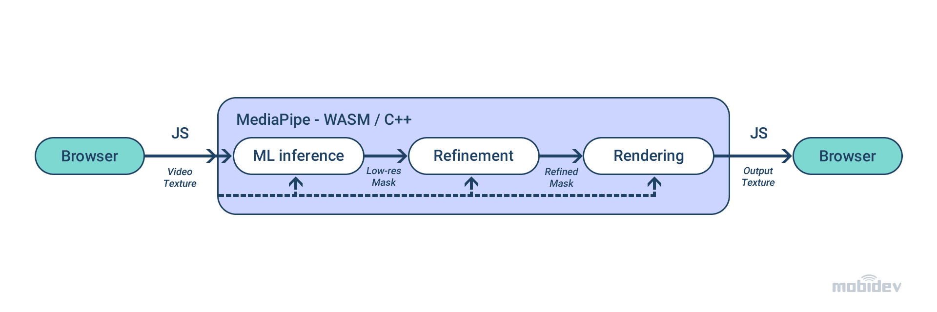 Mediapipe’s solutions are quite flexible. It means that the background replacement in real-time video corresponds with device characteristics. If it’s possible, the user has a top-notch picture. Otherwise, the mask refinement is skipped.