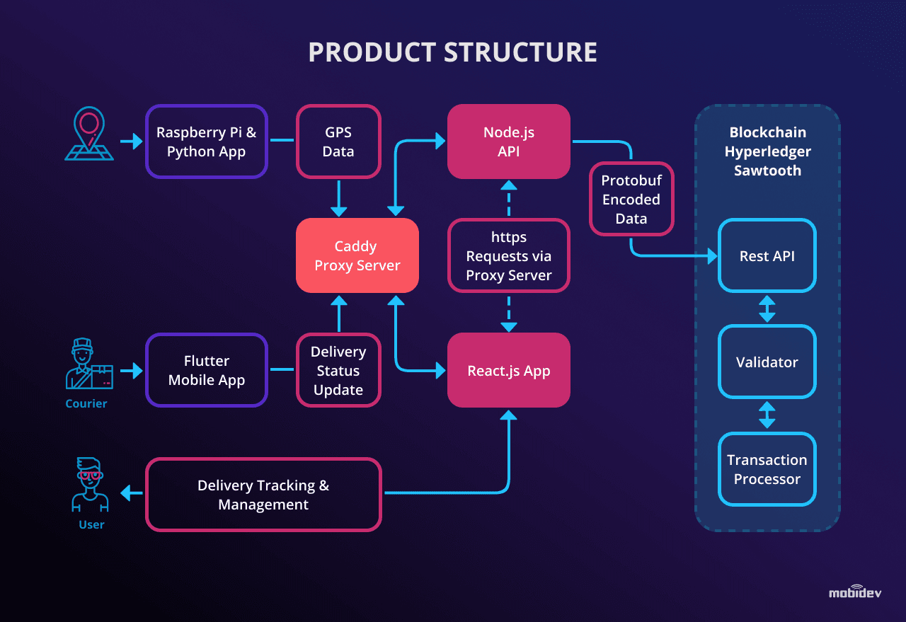 Our blockchain consists of 3 subcomponents: API, Validator, and Transaction Processor. The first two are standard components, while the third one is a custom component that allows to manage deliveries and their states, which are encoded using protocol buffers. The history of transactions is available for each delivery.