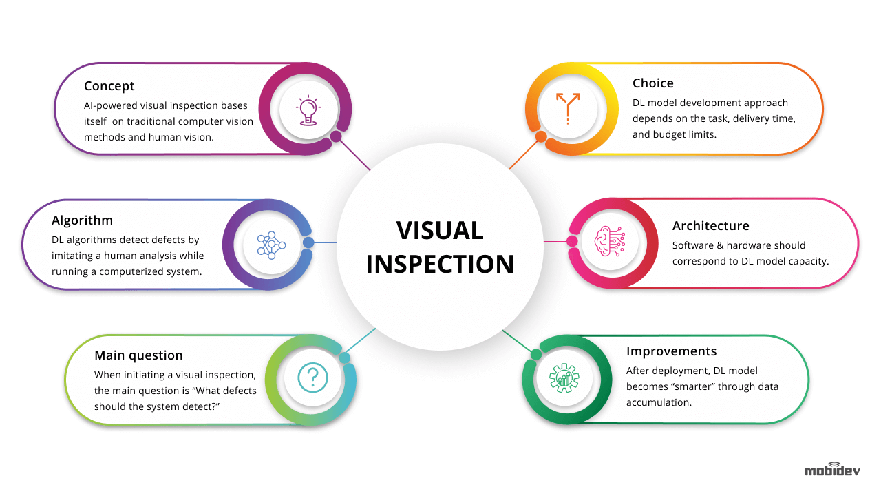 Contact MobiDev to discuss possible approaches to developing an AI inspection system that fits your company needs. Our experts will guide you through all stages of the visual inspection software development cycle, from business analysis and design to deployment and support.