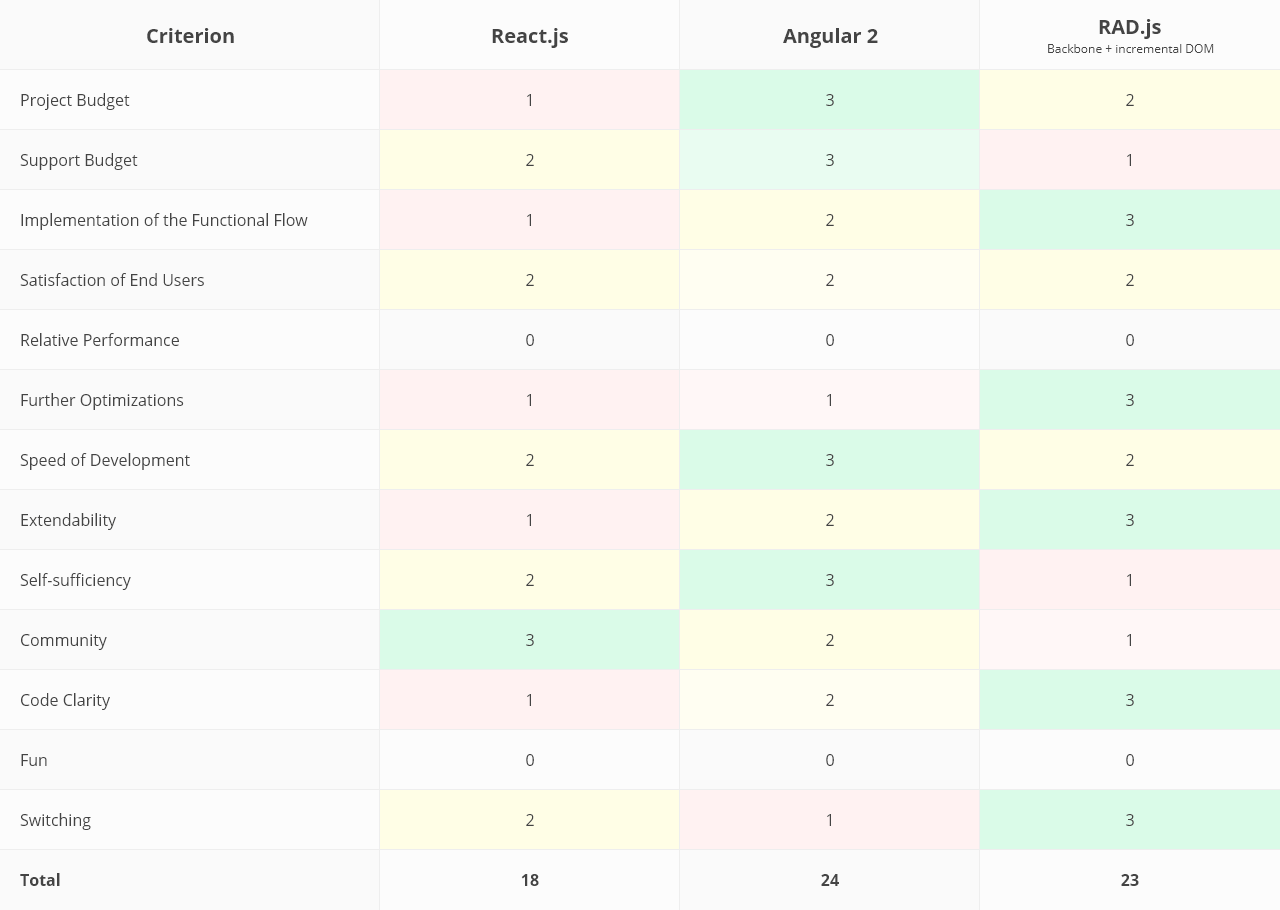 This comparison will include the most popular frameworks: React.js and Angular 2. We are also going to arouse your interest by adding a relatively young and not very popular yet framework developed by MobiDev, which is called RAD.js. However, if you know the criteria, you can analyze any framework this way.