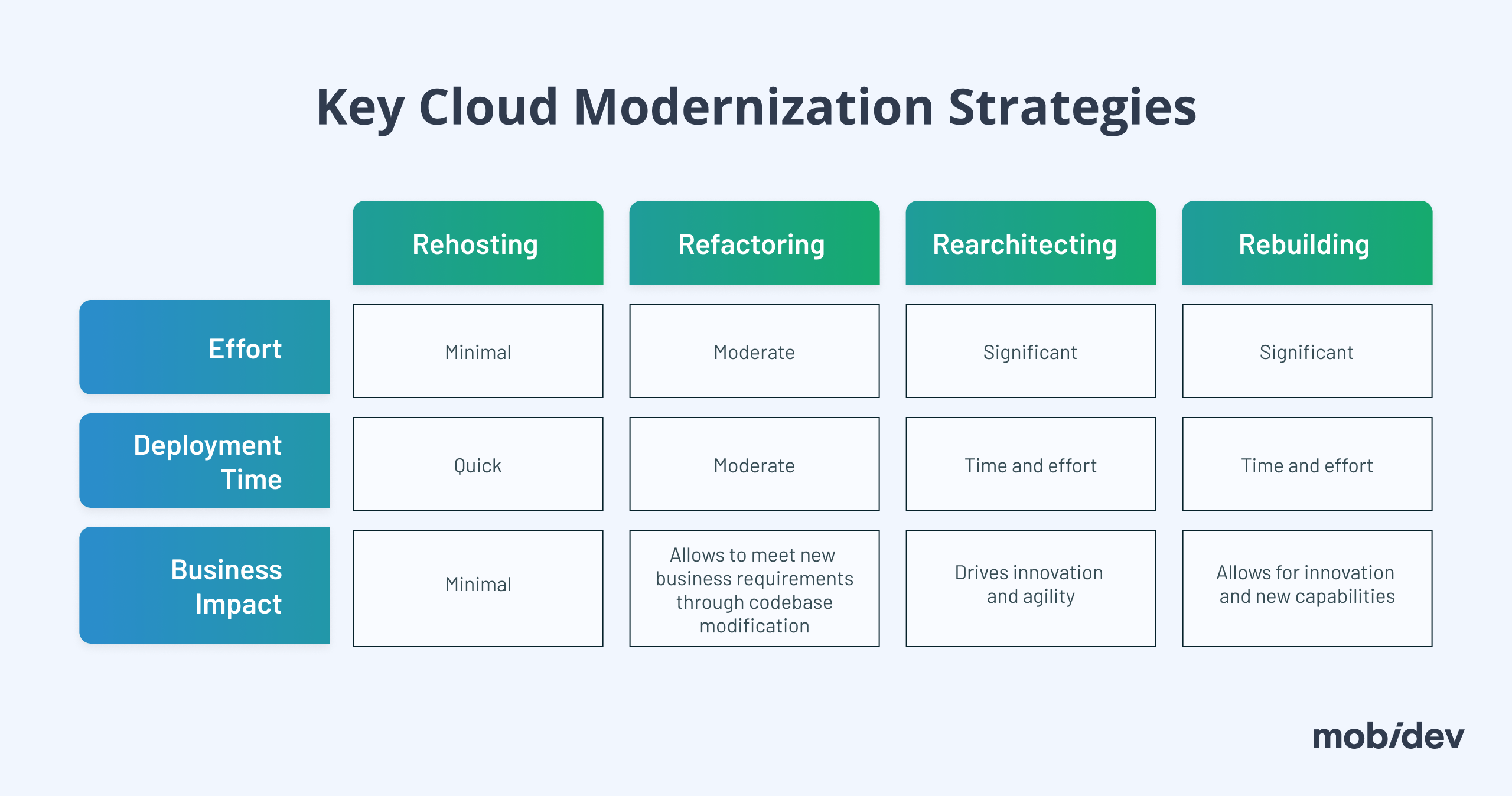 Let’s dive deeper into the key cloud modernization strategies and real-world implementation examples.