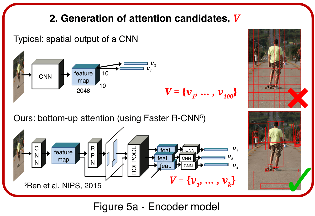 This is LSTM with an added up-down attention mechanism. Given a set of image features V, the proposed captioning model uses a ‘soft’ top-down attention mechanism to weigh each feature during caption generation. At a high level, the captioning model is composed of two LSTM layers.