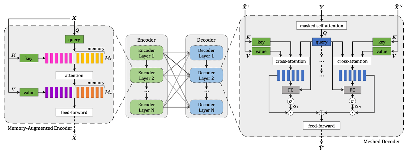 Another model that we took to solve the image captioning task is Meshed-Memory Transformer. It consists of encoder and decoder parts. Both of them are made of stacks of attentive layers. The encoder also includes feed-forward layers, and the decoder has a learnable mechanism with weighting.