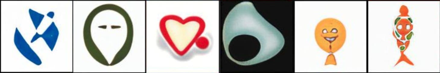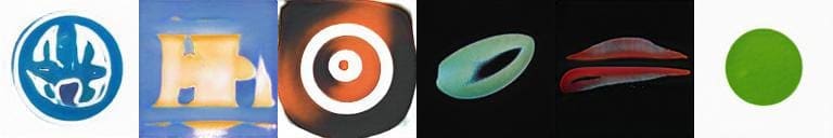 Moving on, let’s take a look at the medium-quality images (Fig. 33). Here we begin to see that some shapes look less like a finished image and more like a transition from one shape to another. Moreover, sometimes the model can produce something very simple, not a bad quality result but not something interesting either. One common problem we saw at this stage is due to the abundance of circular shapes in the training data. Similar shapes would frequently appear in the generated result. That’s why creating a curated and diverse training dataset is essential for getting high-fidelity results — the model learns directly from the data and can be only as good as the data is.