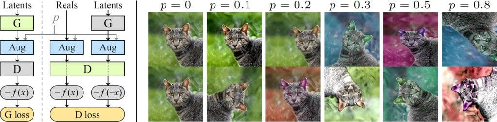 Figure 31. StyleGan2 architecture with adaptive discriminator augmentation (left) and examples of augmentation (right) (source)