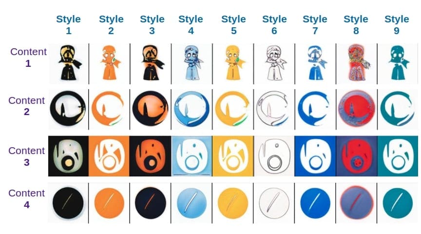 Another interesting option for controlling the look of the generated logotype is partially mixing styles from two logotypes. In the example below, each row uses the same coarse style source (controls the shape of the logotype) while the columns have different fine styles (control minor details and colors), as shown in Fig. 36. As a result, we can imagine that a designer would be able to modify a logotype of a preferred content with a color scheme from another logotype.