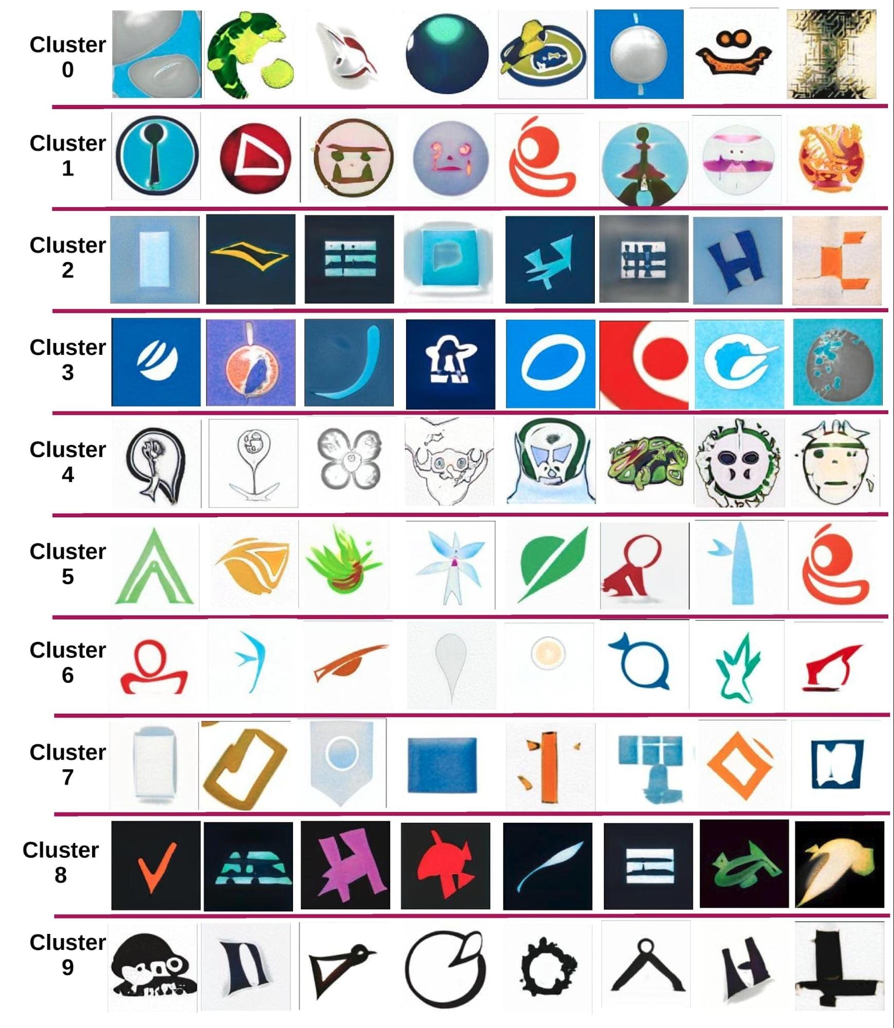 The most interesting results were seen in clusters 0 and 4, as they originally contained the most complex images illustrating all sorts of objects. As a downside, these clusters also had the highest number of failed generation attempts which is reasonable as the number of training examples here was relatively small (~18 % from 50k logos). Other clusters were more stable (e.g. 2, 3, 7, 8) but produced more predictable, less varied geometric shapes. Finally, clusters 1, 5, 6, and 9 offered a combination of more or less unique visual styles and a higher rate of successful generation outcomes.