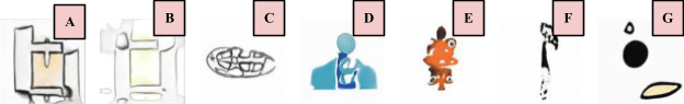 Finally, we arrive at poor-quality results (Fig 34). A significant portion of these images are an attempt by the model to generate the shapes it has not yet learnt properly or the shapes that did not have sufficient number of training examples. For example, GAN often tried to produce sketch-like images (Fig. x A-C) but could not output anything worthwhile. As discussed previously, many sketch images were found in cluster 4 (Tab. 1). A small number of examples and the complexity of the sketches make the training task too difficult to figure out. We assume this can be fixed by providing the model with a greater number of sketch images.