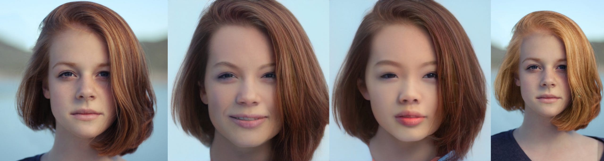 Figure 14 – Generated face customization (Source: Generative Photos). Left to right: original, adding smile and age, race editing, hair color editing.