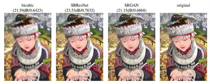 Figure 5. Upscaling image using GAN (SRGAN) in comparison with non-machine learning bicubic interpolation method and non-GAN ML method SRResNet (source)