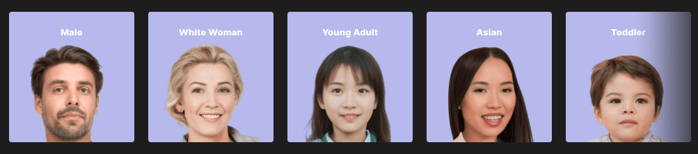 Generated Media Inc – this company applies the StyleGan model to create synthetic facial photos of varying ethnicity, age, and gender. While the generation process is nothing remarkable (the company mentions they use StyleGAN by Karras et al. and Nvidia), the interesting point is how the partner companies use the AI generated photos.
