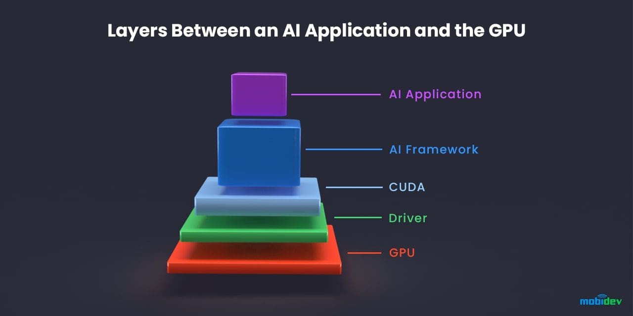 Usually, traditional deep learning frameworks like Tensorflow, Pytorch or ONNX can’t directly access GPU cores to solve deep learning problems on them. Between an AI application and the GPU there are a lot of complex layers of special software like CUDA and drivers for the GPU.