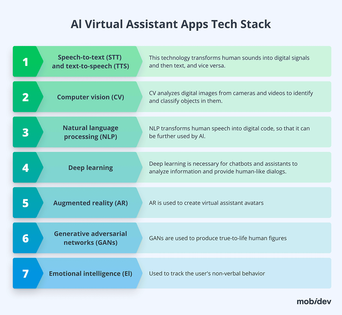 To learn more about how to build virtual assistants of differing complexity, check our AI Virtual Assistant Technology Guide. This article elaborates on the tech stack that will be required for building each type of virtual assistant.
