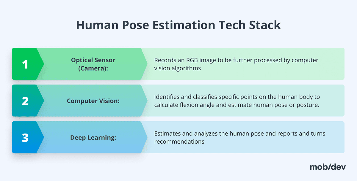 A typical human pose estimation (HPE) model analyzes an RGB image of a human taken by a scanner or a usual smartphone camera, and detects key body parts and their position as a person moves in the 3D space. Further, a deep learning algorithm like Open Pose, Deep Pose, or DeepCut, evaluates the overall position of the detected points and provides recommendations for improvement.