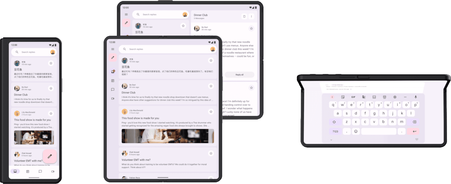 For instance, most users operate their smartphones with one hand. In the unfolded state, interaction will require the use of both hands. Therefore, the placement of user interface elements should be adjusted accordingly. This is relevant for applications like email clients, where you can extend the keyboard to a separate screen in flat mode, creating a laptop-like experience.