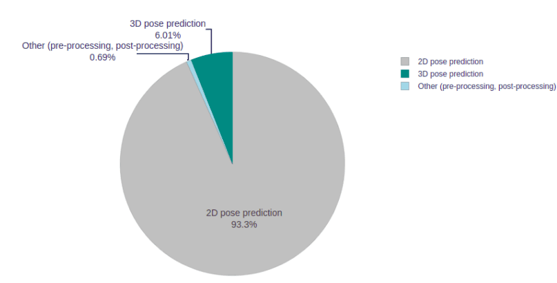 In terms of speed, our model achieves about 46 FPS on the above-mentioned hardware without video rendering where the 2D pose detection model produces keypoints with about 50 FPS. In comparison to the 2D pose detection model, the modified 3D baseline model can produce keypoints with about 780 FPS. The detailed information about the spent processing time of our approach is presented below.