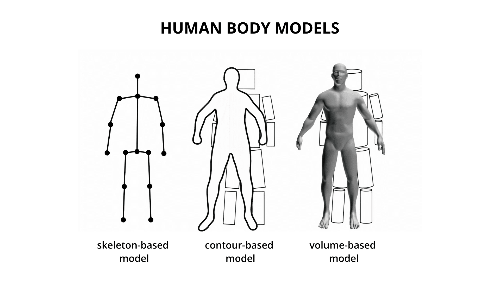 There are three common types of human models: skeleton-based model, contour-based, and volume-based. The skeleton-based model is currently the most commonly used one in human pose estimation because of its flexibility.