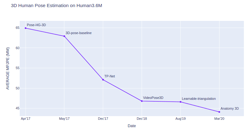 The evaluation metric is MPJPE (Mean Per Joint Position Error) which shows the distance averaged over all joints measured in millimeters. In other words, this metric shows how accurately each specific model detects joints over time. The graph represents the analysis of several open-source models trained for human pose estimation tasks.