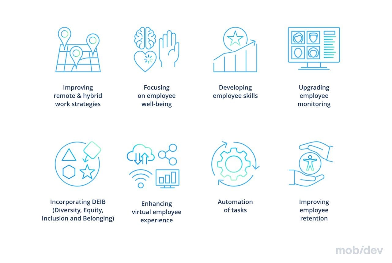 Human resources trends are equally substantive to you whether you require digitalization of your HR department or are considering your next startup related to human resource software products. Having created software solutions since 2009, MobiDev experts are always up to date with the latest developments in the industries in which we operate, including the human resources domain. Moreover, we’ve built our own custom people management system for our company called MD People, so this HR trends guide is based on our practical expertise and clients’ case studies.