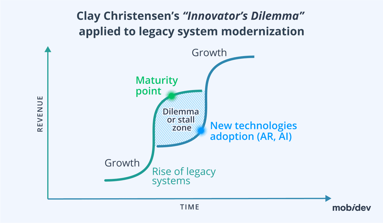 The blue-shaded area represents the dilemma or stall zone, where businesses face the decision of whether to continue with the legacy systems or transition to new technologies. This period is marked by uncertainty as the potential benefits of modernization are weighed against the risks and costs.