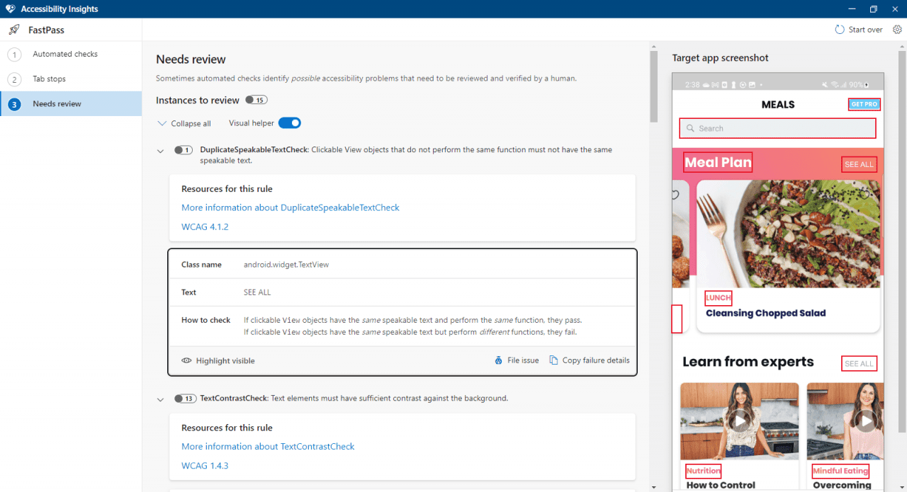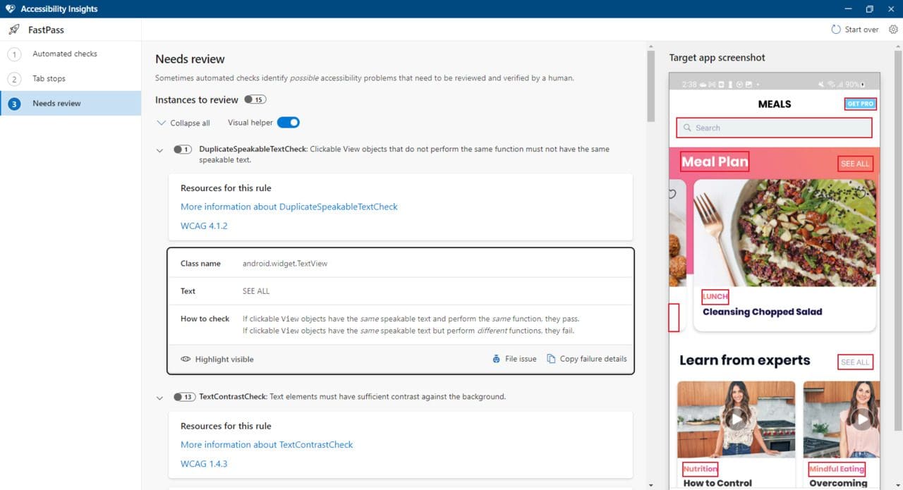 Here is how the checking process might look while using Accessibility Insights for Android.