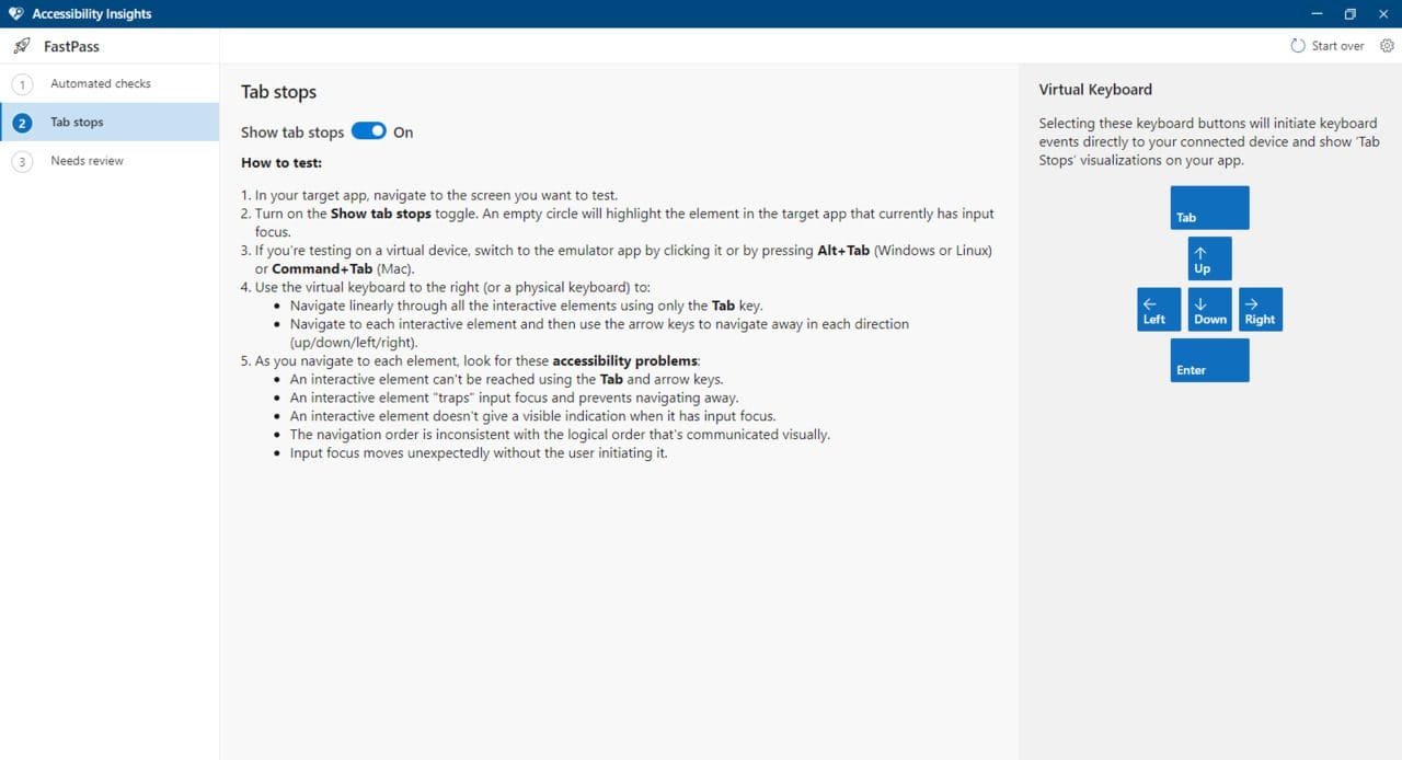- Use the manual test for tab stops. The Tab stops test can be completed on a virtual or physical device using the virtual keyboard built into Accessibility Insights for Android.