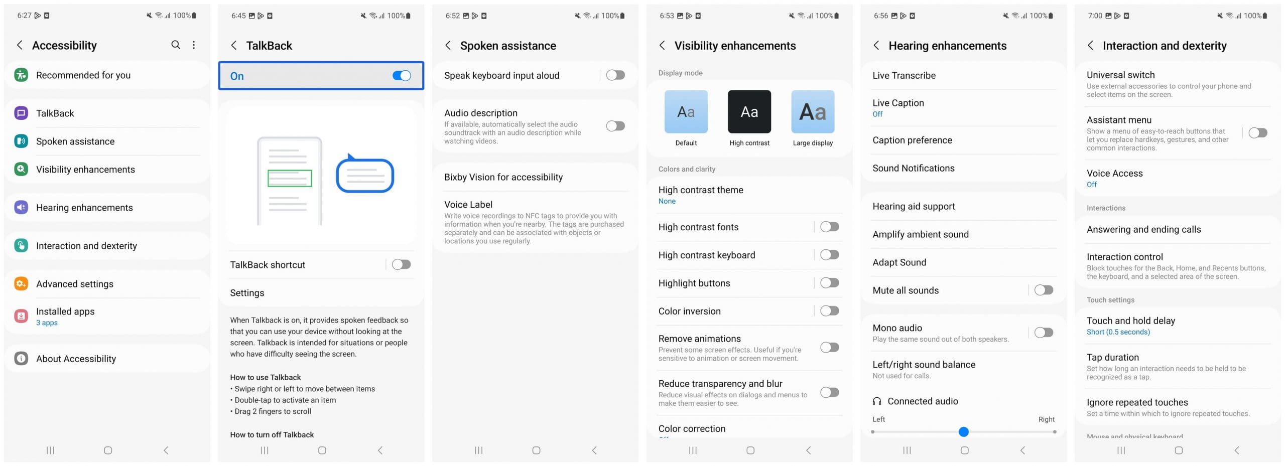 TalkBack is a built-in Android screen reader that can read everything on the screen. In apps, this includes all buttons, images, form elements, static text, etc. In the mobile browser, this should include all web content (text, alternatives for images, links, form fields, tables, etc.). TalkBack is used by blind and low-vision users, and also by users with some cognitive or learning difficulties. It’s also possible to enable more advanced settings like Text-to-speech, Vibration Feedback, and Spoken assistance.