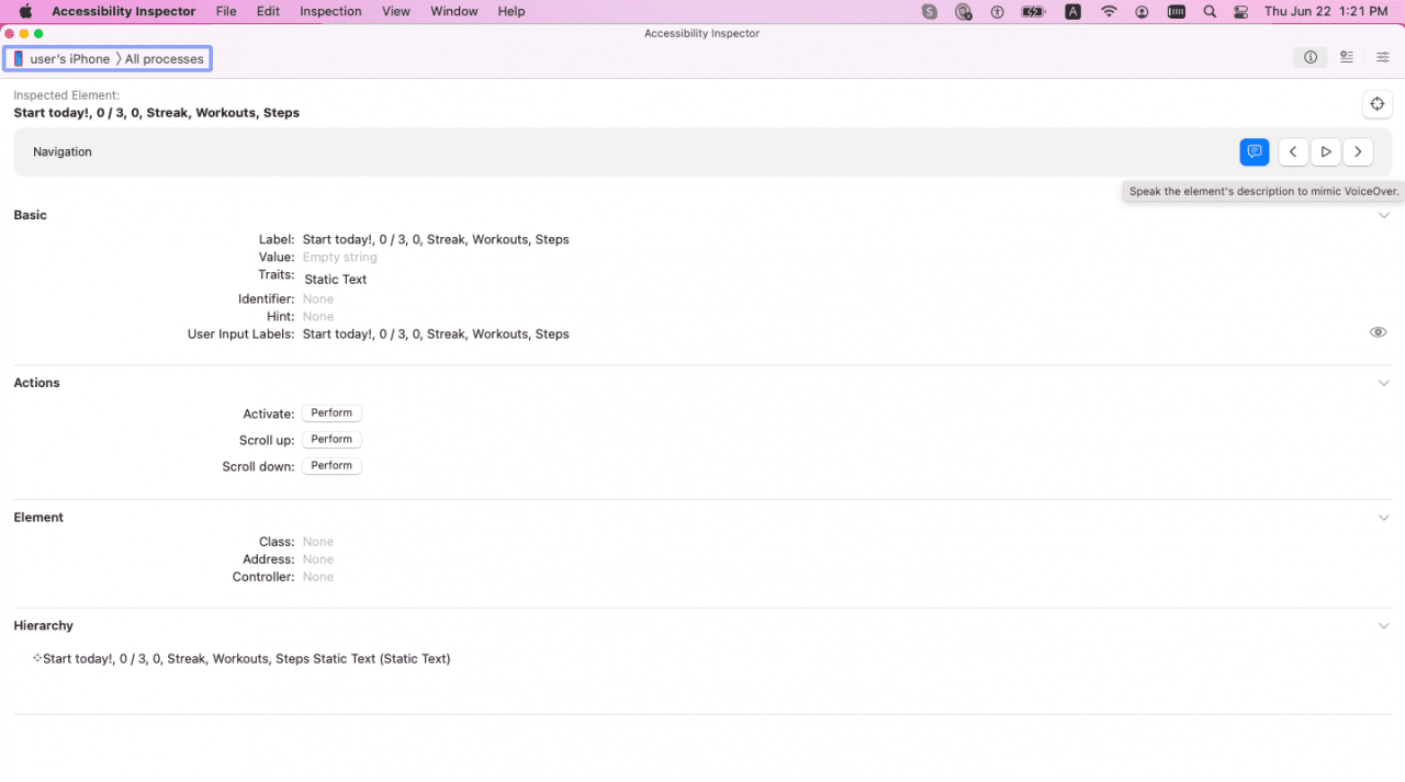 Once you’ve chosen the device or simulator, the Accessibility Inspector will show all of the basic settings, actions, element details, and UI element hierarchy. For the purposes of accessibility, we’re going to focus on the “Basic” section. In here, you can see the values set for the accessibilityLabel, accessibilityValue, accessibilityTraits, and the accessibilityIdentifier. By pressing the “Audio” button, you can also hear the label read aloud. Keep in mind that this isn’t always exactly what VoiceOver speaks on a device! For one thing, it does not voice or show the accessibilityHint.