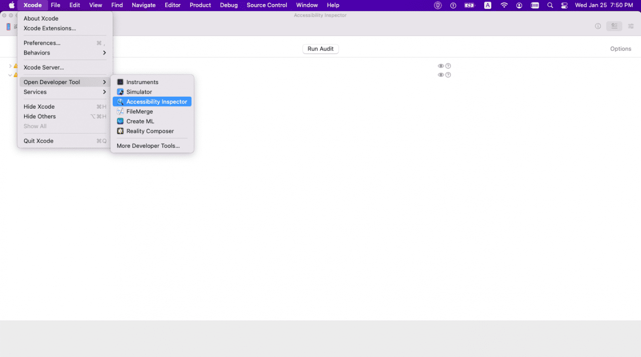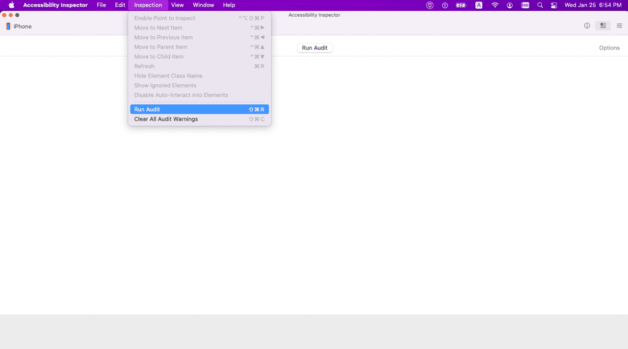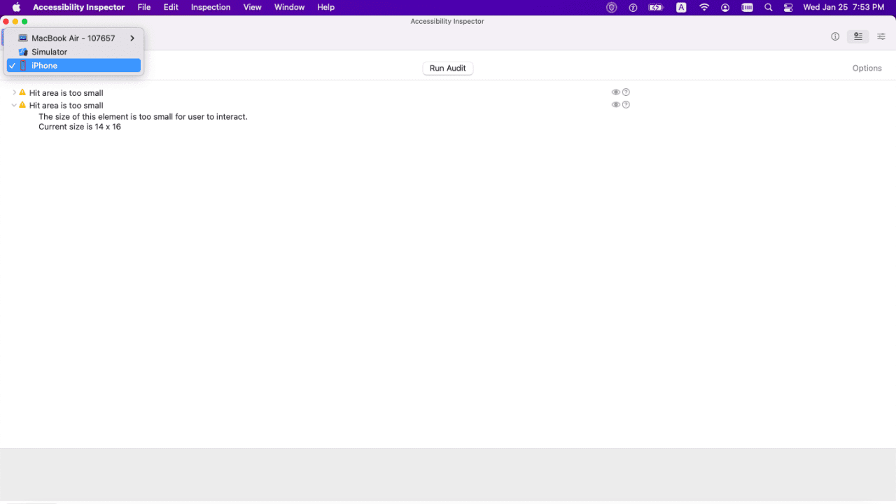 In order to use the Accessibility Inspector to check your app, you’ll have to connect your device to your MacBook or launch your app in a simulator. Once it’s connected, it will show as an option in the device dropdown.