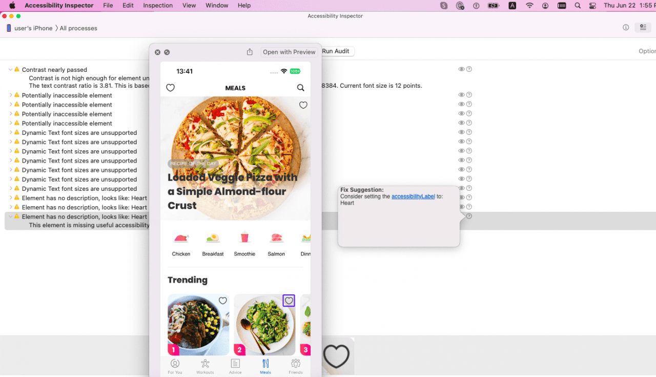 Simply switching to the audit screen and pressing “Run Audit” gives you a list of issues to fix. Above, you can see that the screen audited is missing accessibility settings on multiple UI elements, and its labels don’t allow for dynamic sizing. The eye button next to each item will show you which UI element the warning is referring to. There is also a button with a question mark in a circle next to it that which provides suggestions on how to fix the issue.