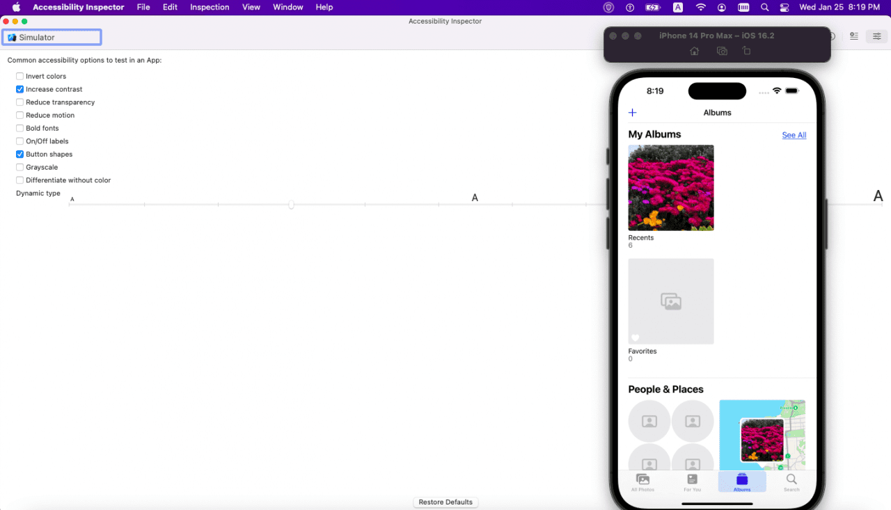 Accessibility Inspector settings allow you to make real-time adjustments to your app to test accessibility. For example, if you enable Dynamic Text on a label, using the font size slider will change the size of text on the simulator immediately.