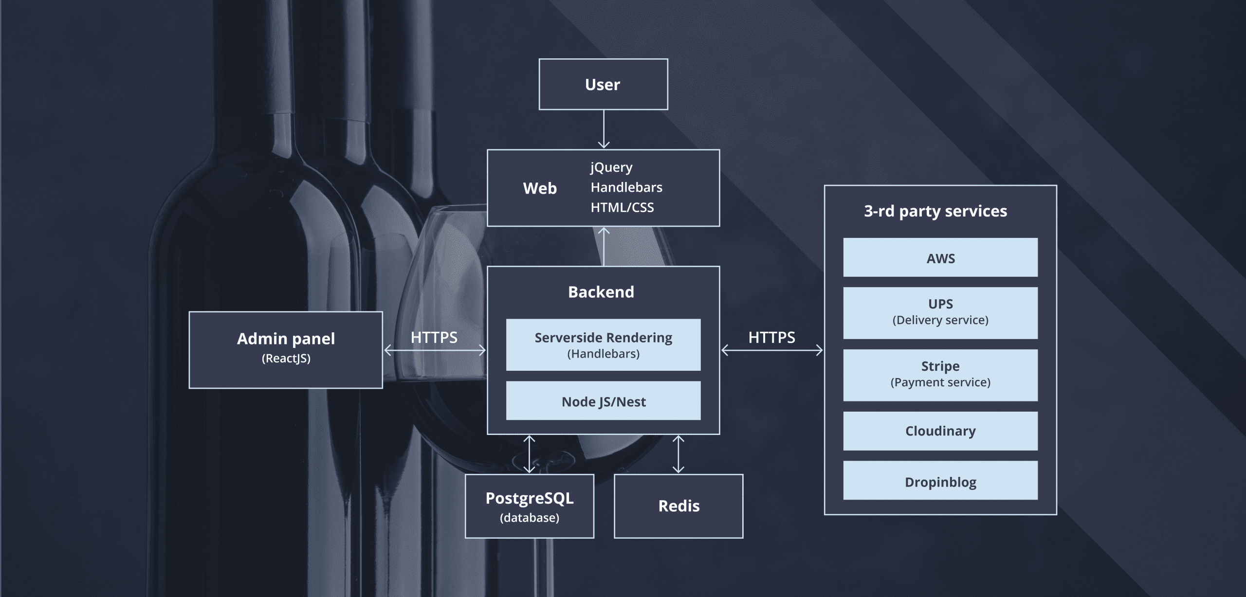 Through Node.js web development, it was possible to implement the domain logic that ensures the operation of the international marketplace. Now, when the user connects to the platform, he gets to exactly the segment that corresponds to the country where the winery is located. MobiDev developers built the functionality of automated price calculation, already taking into account taxes, customs duties, and delivery costs. The system automatically creates a package of documents for each order in the seller’s account, under the legal norms of the EU and the country selected by the user, as well as delivery options. Thus, the buyer, having chosen a product, immediately learns about its final price for each of the nine countries of delivery and consciously makes a decision to purchase. Execution of transactions concluded on the marketplace is a combination of developed features of the system and integration of third-party solutions.