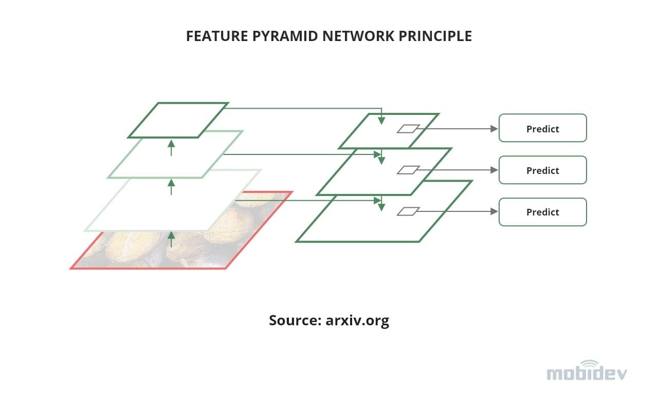 For example, the selected for our experiments model config R50-FPN uses backbone ResNet-50 with Feature Pyramid Network – a concept that was introduced in the CVPR 2017 paper and since then has become a staple of CNN backbones for feature extraction. In simpler terms, in Feature Pyramid Networks we use are not just the deepest feature maps extracted from CNN but also low- and medium-level ones. This allows small object detection that would be otherwise lost during the compression down to the deepest levels.