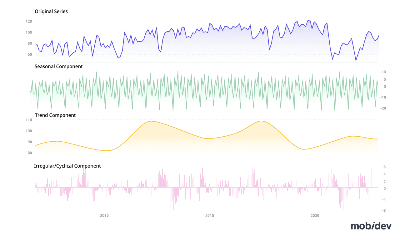 This visualization demonstrates data decomposition, extracting trends, and seasonal or other factors from input data. It’s divided into several graphs: