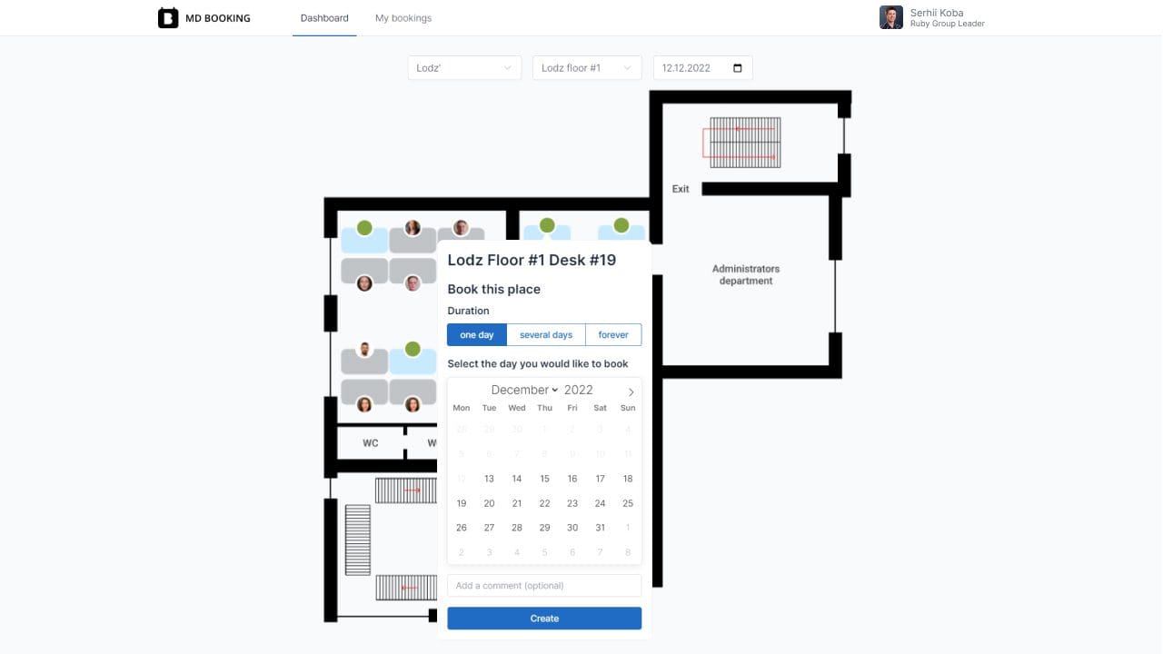 This web app helps manage and book Desks and Meeting rooms in the office. The tech stack consists of the most recent technologies and their versions: Rails 7, Hotwire, Stimulus, Dry-monads, Sidekiq, Administrate, Oauth, etc.