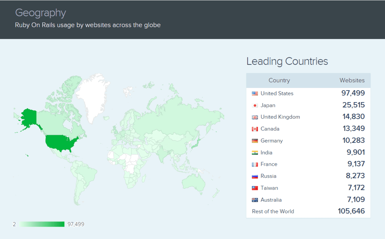 Stack Overflow reveals the list of the most popular technologies, where Ruby is in 14th place: 6.37% of respondents (professional developers) leverage it.