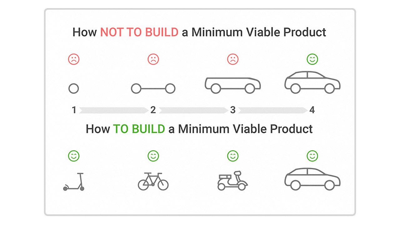 MVP is a software product created with minimal costs and time, but it provides the user with a certain value, a certain set of features. It is not an unfinished product. The user gets a viable version that will receive more features in the future. MVP helps solve the same problems as a regular software product, although in a simpler way. For example, a person must move from point A to point B in real life. A skateboard will make a good start. When this person starts earning more money, they’ll purchase better vehicles.