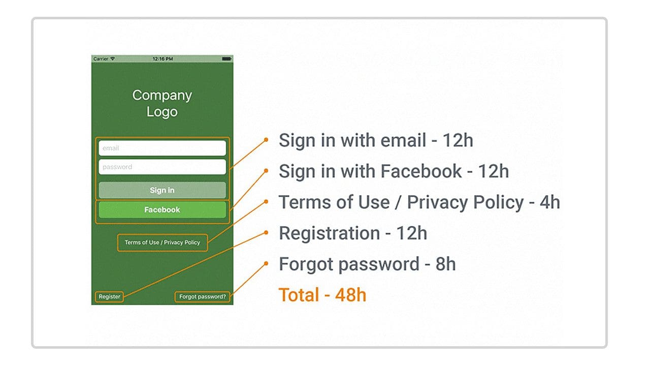 - This estimate is impossible without UI/UX design estimation, acceptance criteria, and product specification. This slows things down.