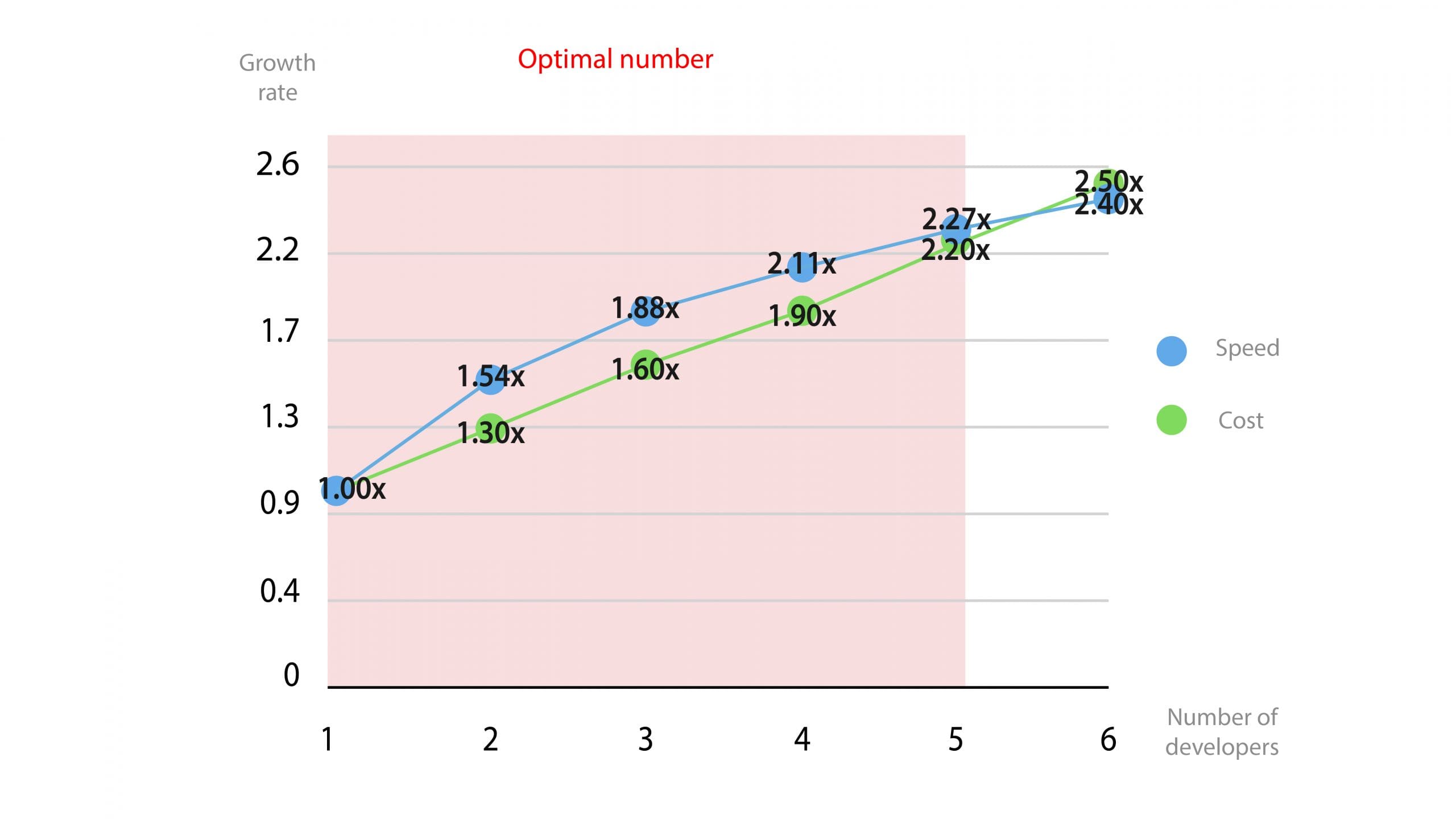 Let’s look at a graph that shows how we speed up the development by the involvement of several developers, and how the costs grow accordingly. This is exemplified by a software project that takes 1 developer and 3 months (480 hours).