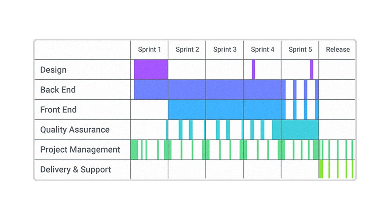 For example, if the backend is estimated to take 600 hours, and the app – 520, the work on the app should be started 80 hours (2 weeks) later—which is approximately the amount of time averagely required for the design. This makes the perfect start of the project: we start with the design and backend development, after the design is ready, we start the development with some basic functionality already implemented on the backend. The deadlines must match. When the design is ready, the front-end developer will already have the design and basic functionality of the backend, which allows painless development. This approach makes for the optimal balance between cost and duration of development. This project plan is shown below as a Gantt chart.